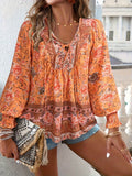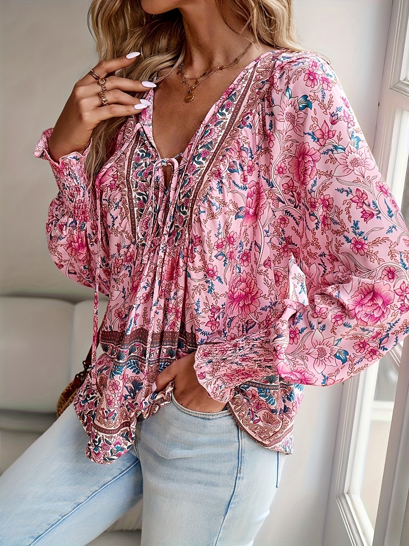 Sale Vibrant Floral Print Tie Neck Blouse - Soft Micro Elastic Polyester Fabric, Casual Long Sleeve Shirt