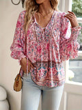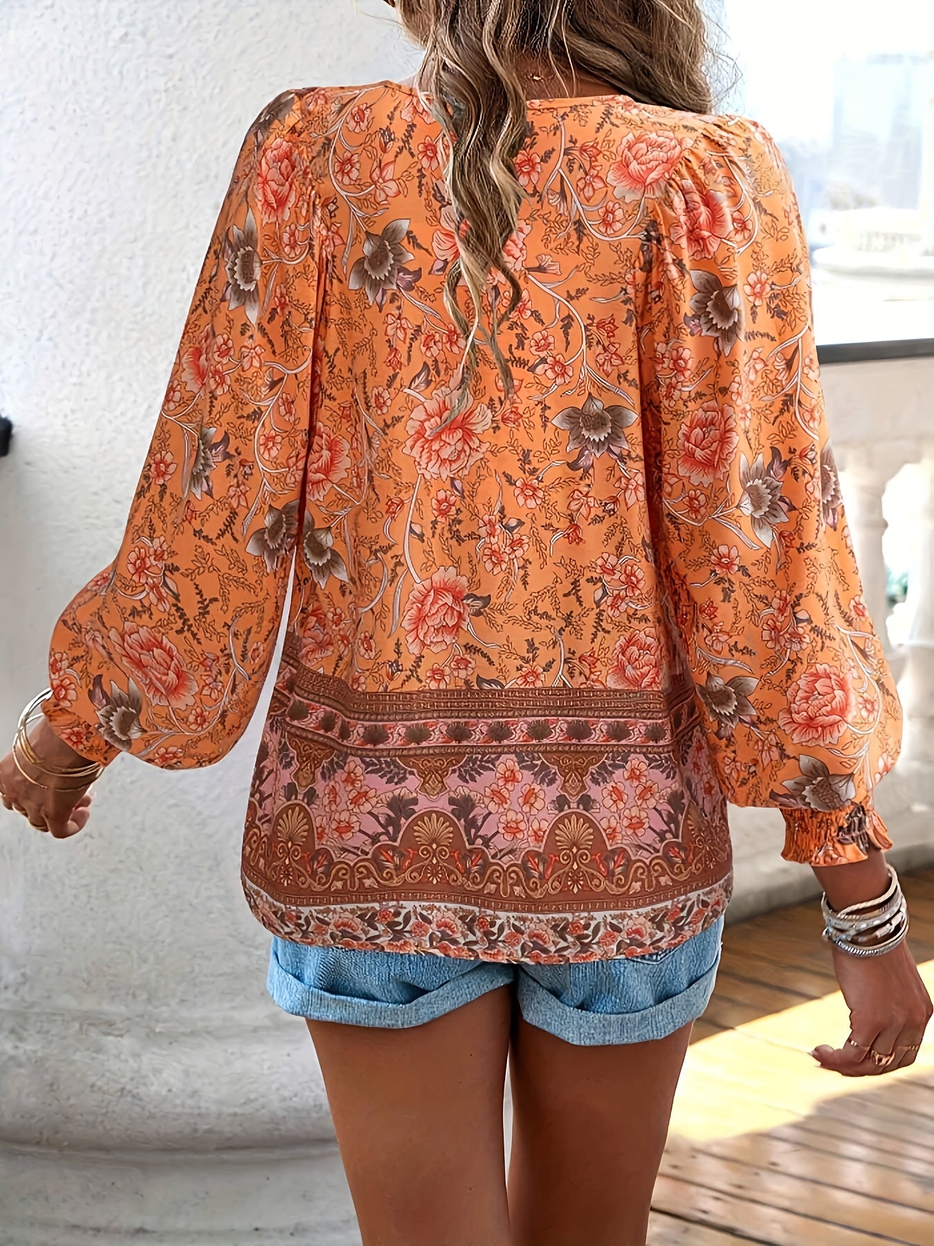 Vibrant Floral Print Tie Neck Blouse - Soft Micro Elastic Polyester Fabric, Casual Long Sleeve Shirt
