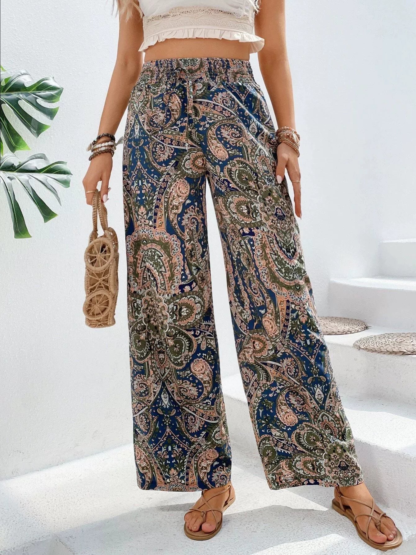 Vibrant Tropical Print Wide-Leg Pants for Women - High-Waisted, Loose Fit