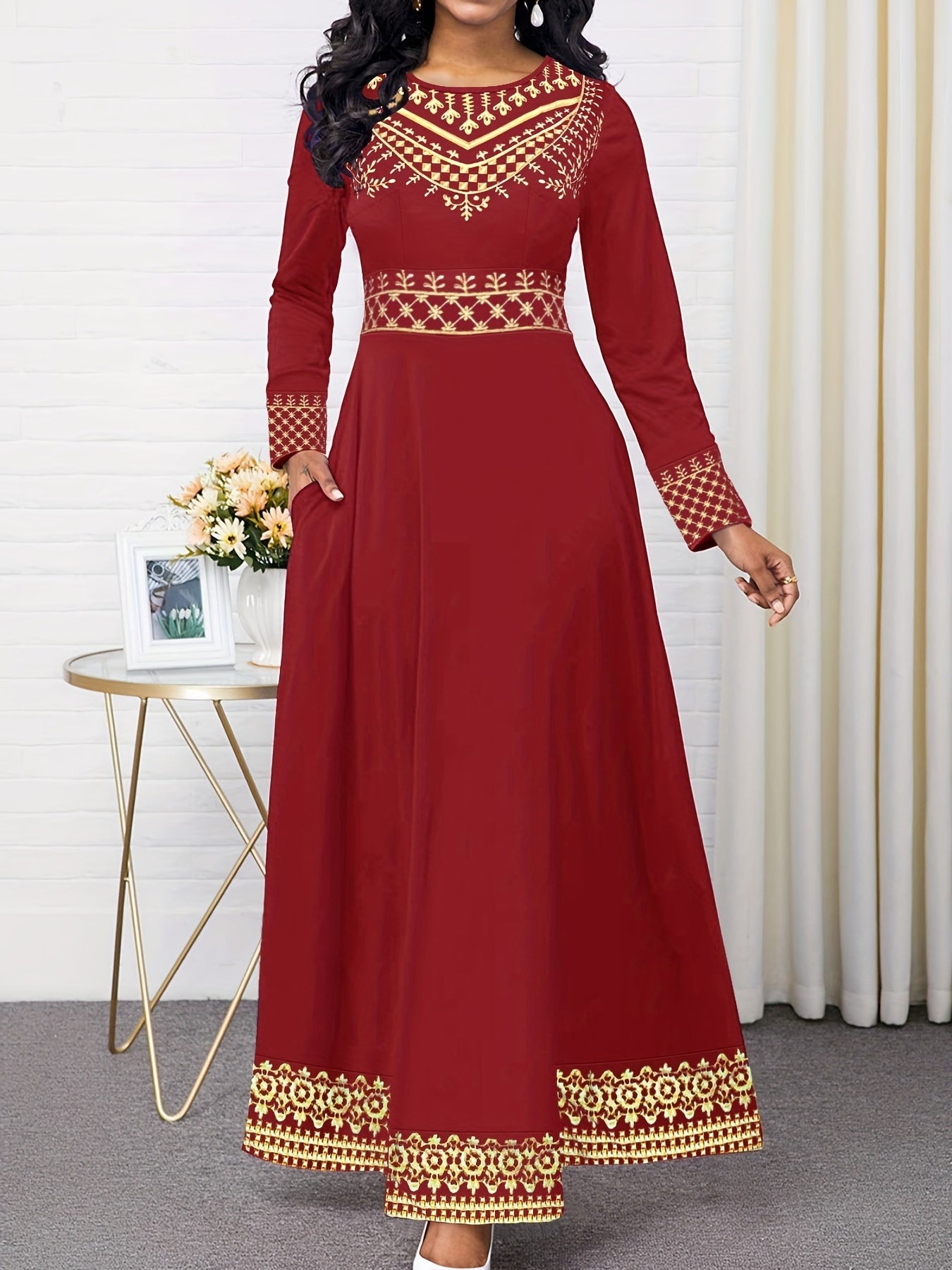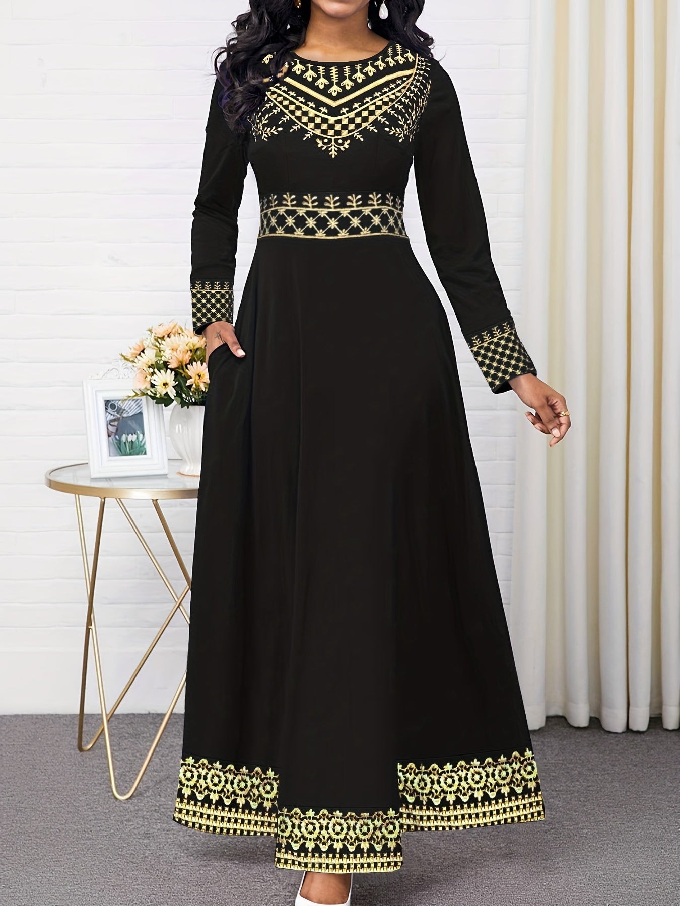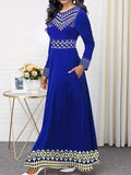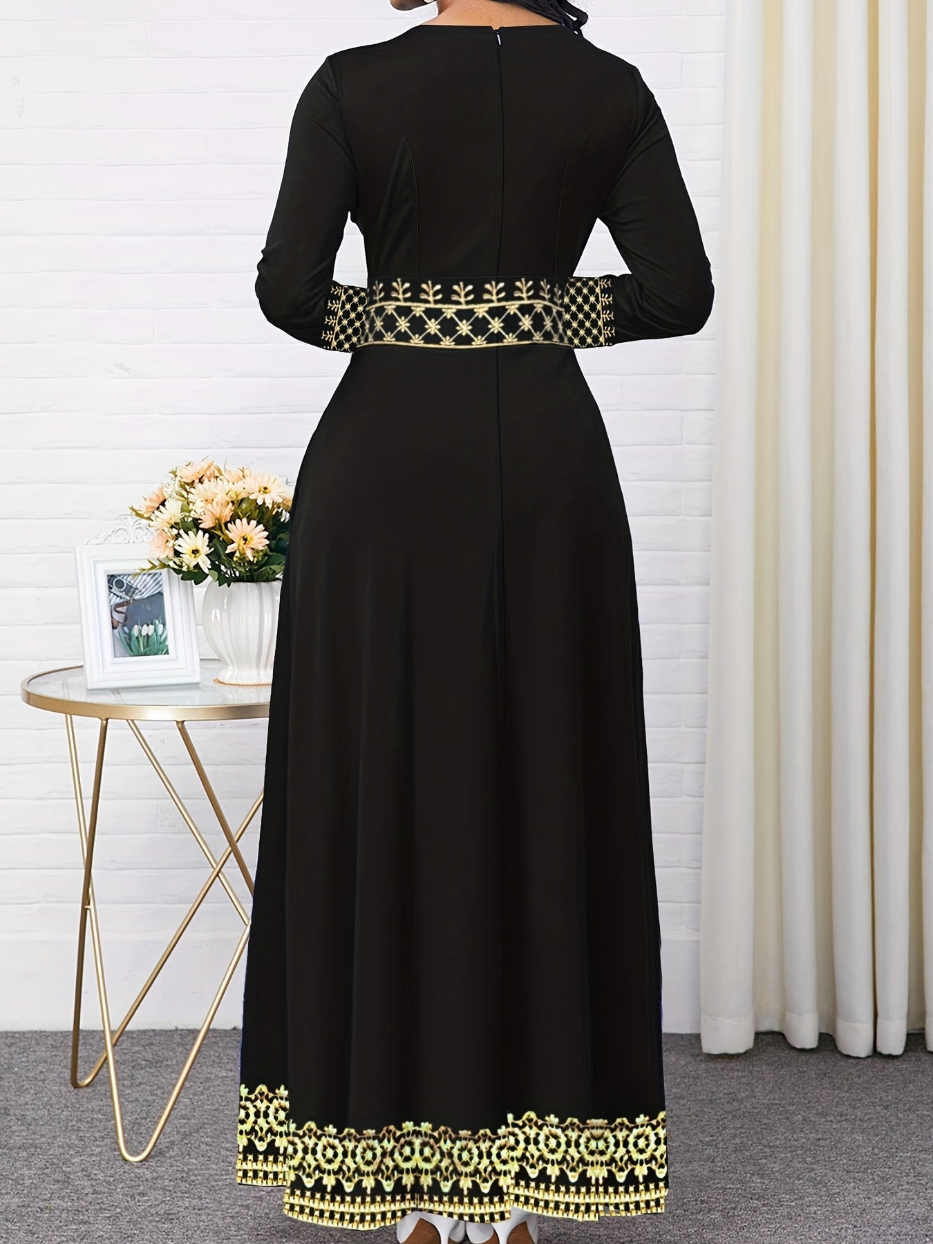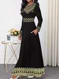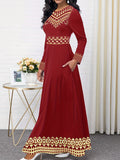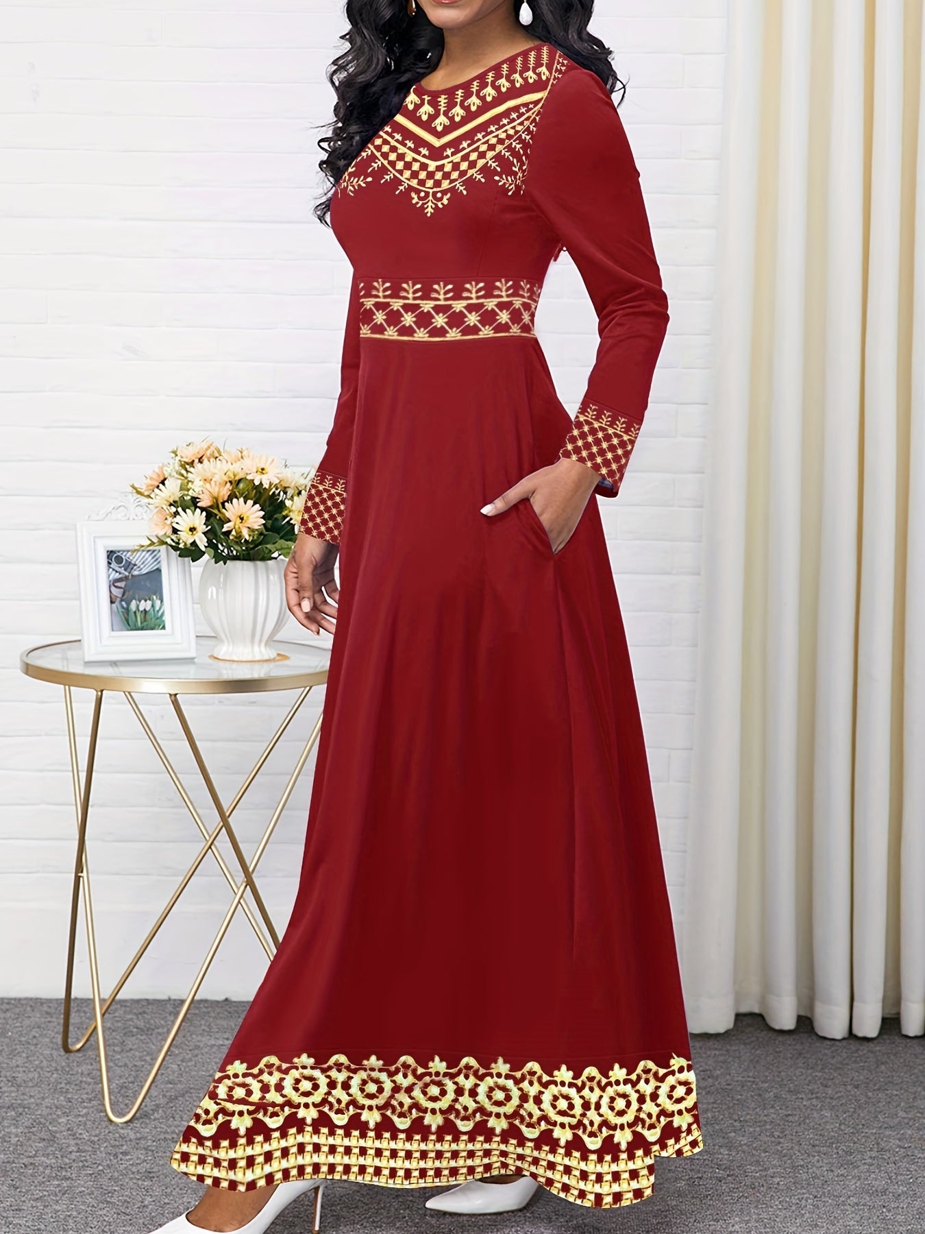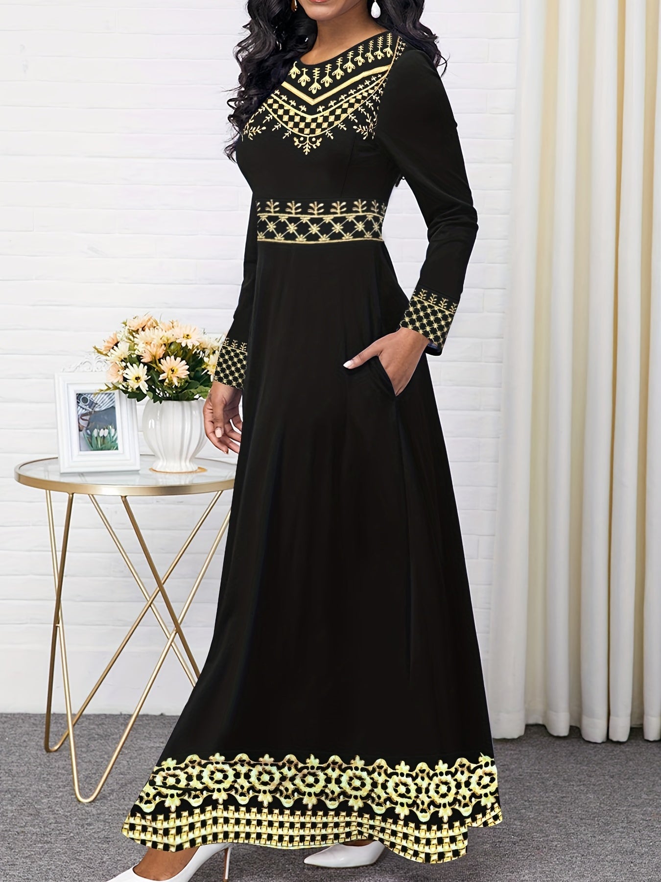 Vintage Print Long Sleeve Elegant Dress, Crew Neck Long Sleeve Dress