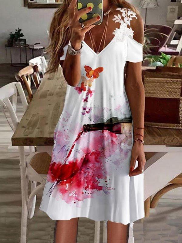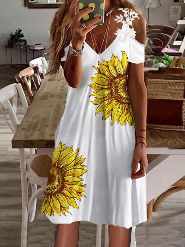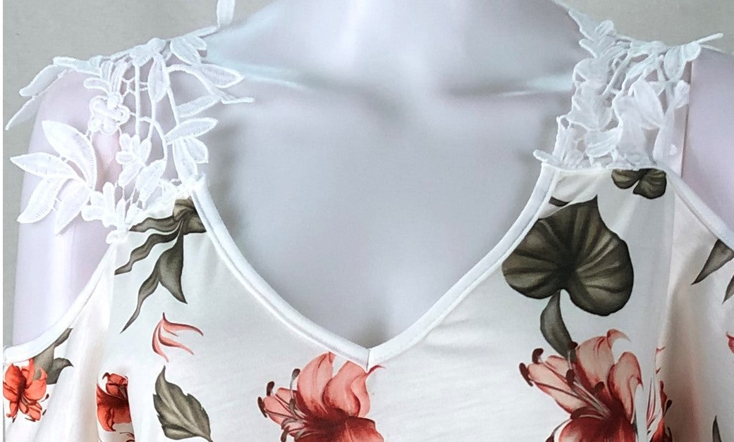 V Neck Ruffles Lace Off Shoulder Crochet Midi Dress