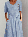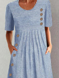 Women Striped Crew Neck Short Sleeve Comfy Casual Buckle Midi Dress