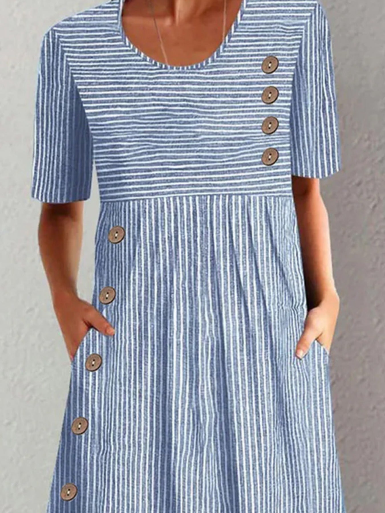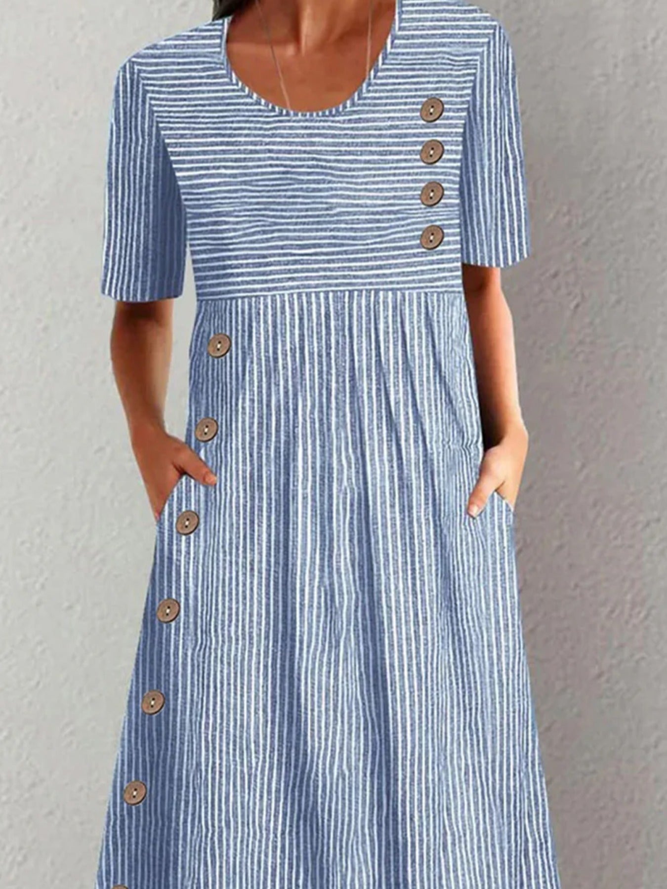 Sale Women Striped Crew Neck Short Sleeve Comfy Casual Buckle Midi Dress