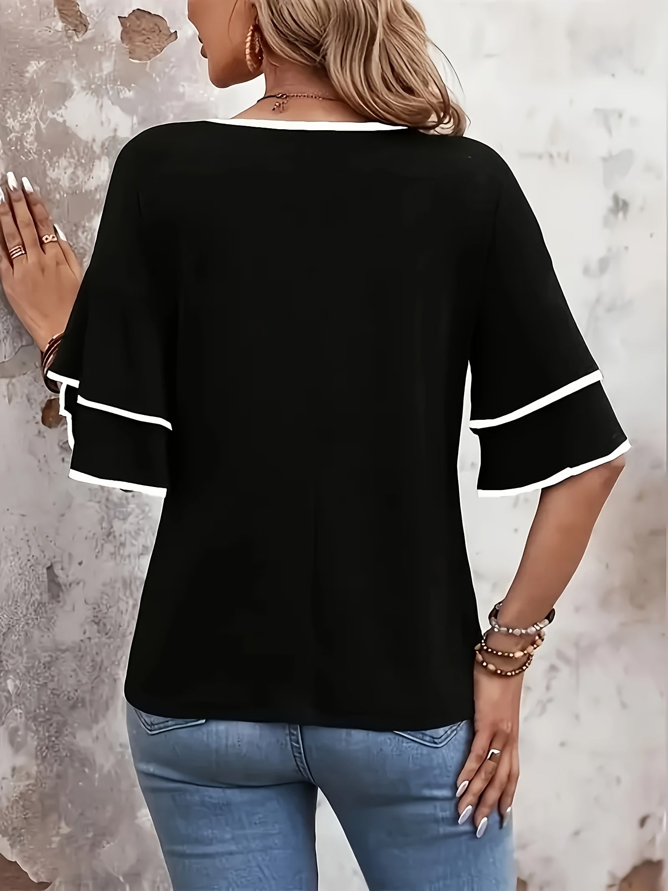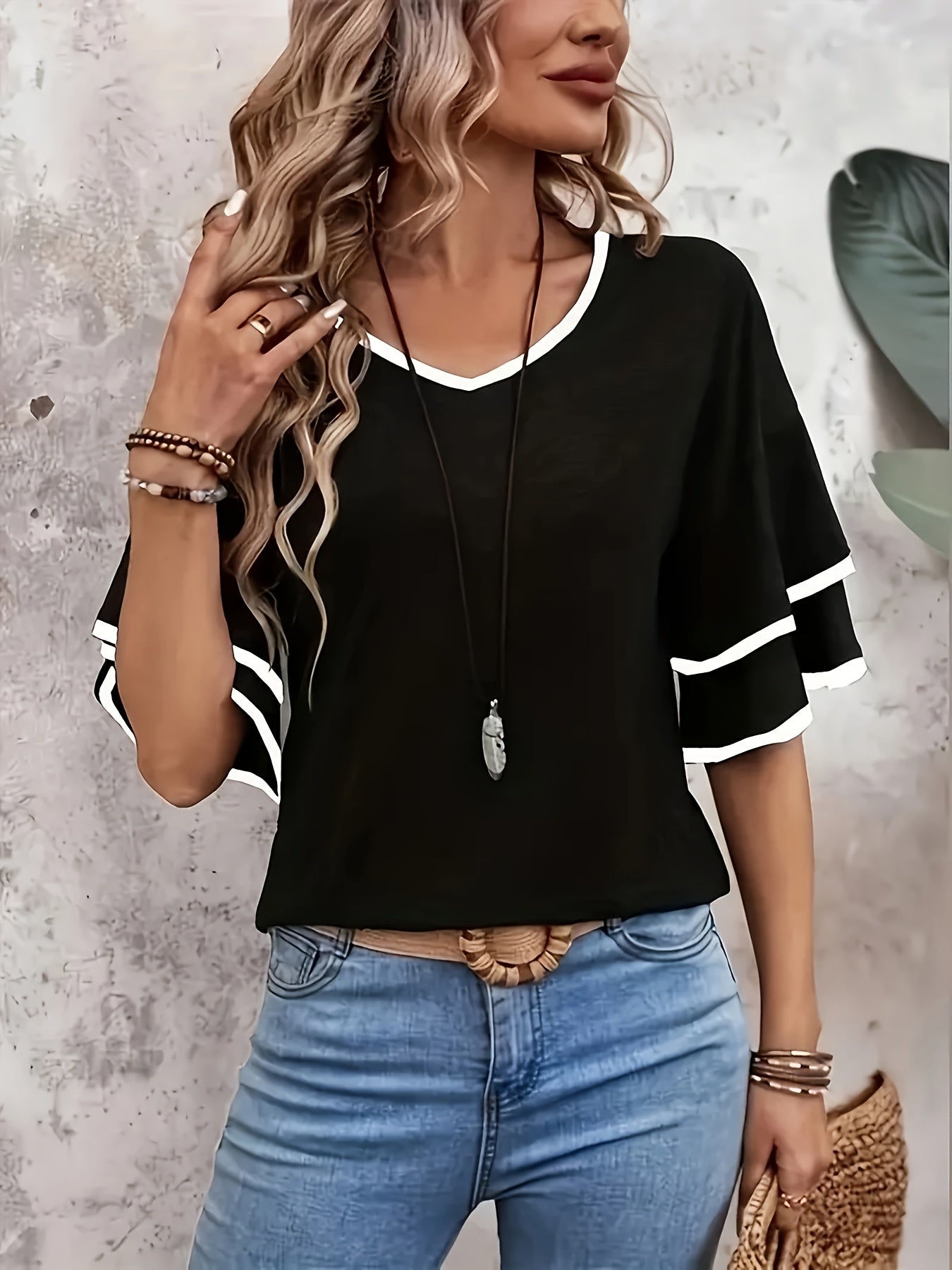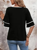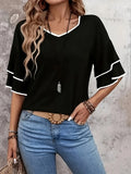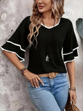 Sale Solid Pleated Trim Blouse, Casual Crew Neck Short Sleeve Blouse