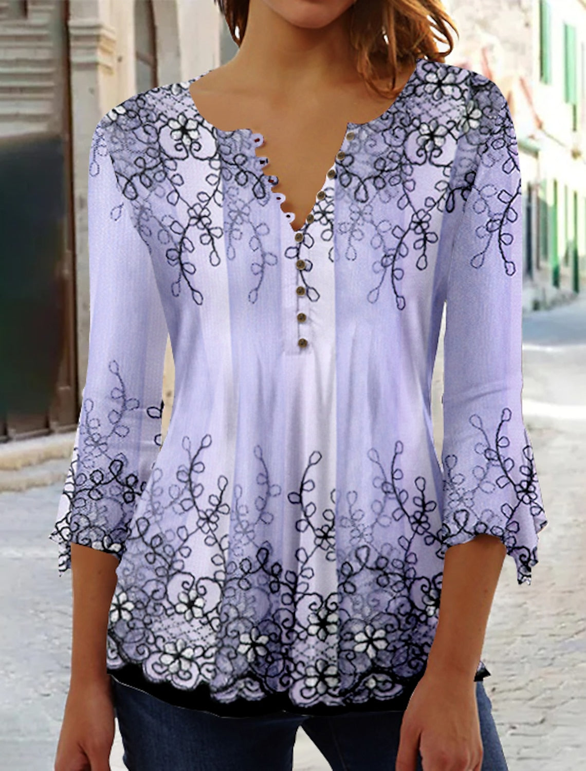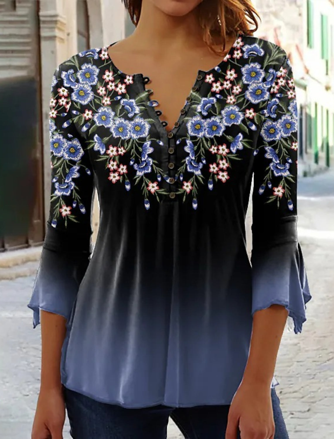 Sale Women's Floral Button Print 3/4 Length Sleeve Casual Shirt