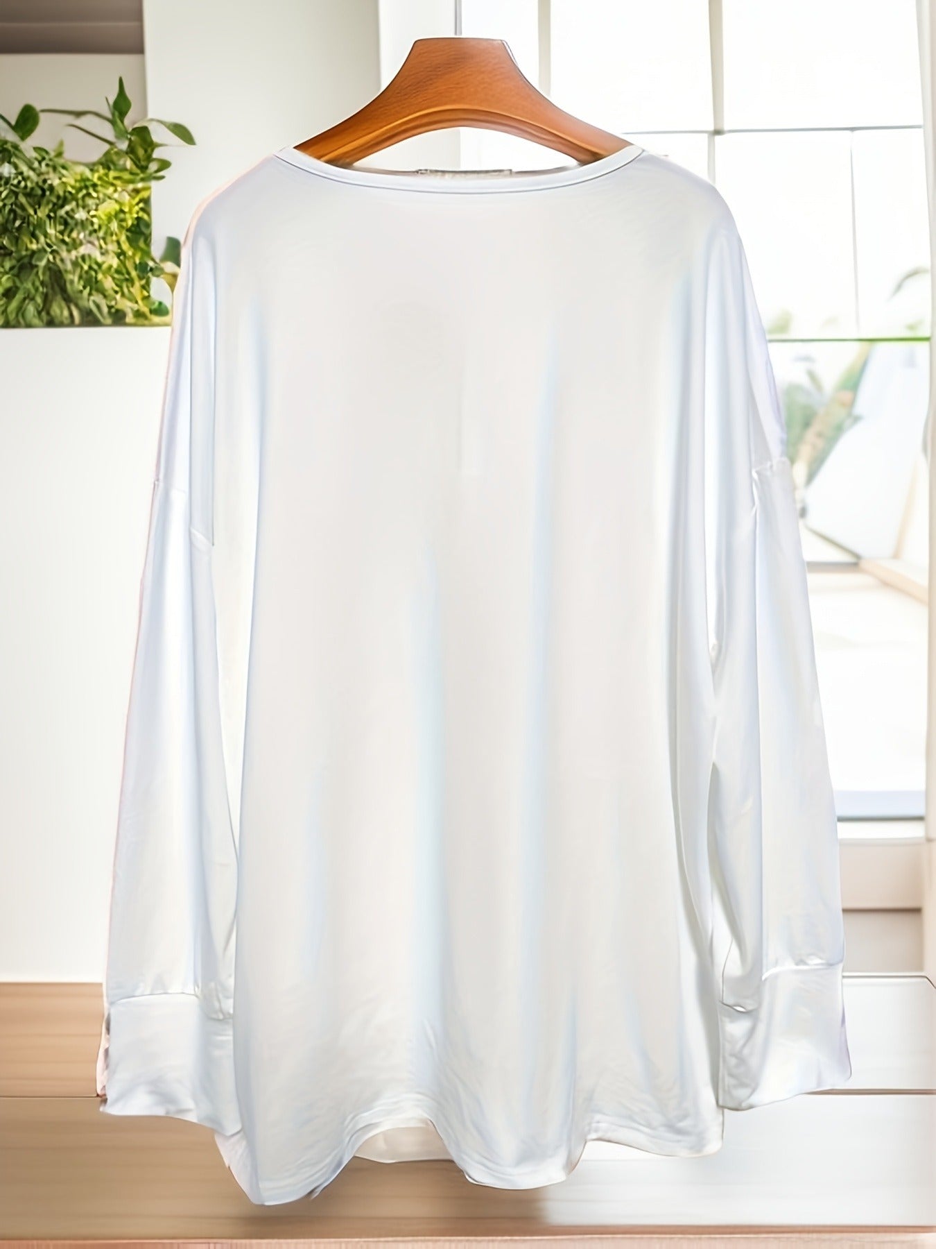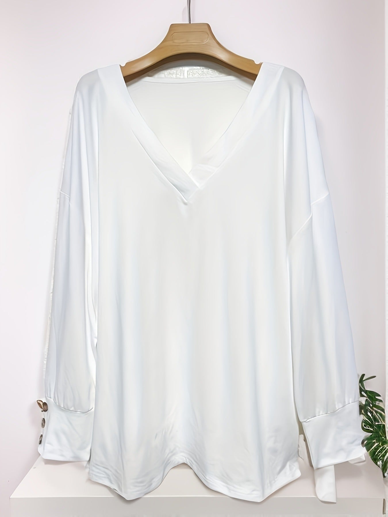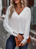 Sale Women's Solid Button Decor Long Sleeve V Neck High Stretch Top