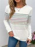 Sale Women's Stripe Print Long Sleeve Round Neck Slight Stretch T-shirt