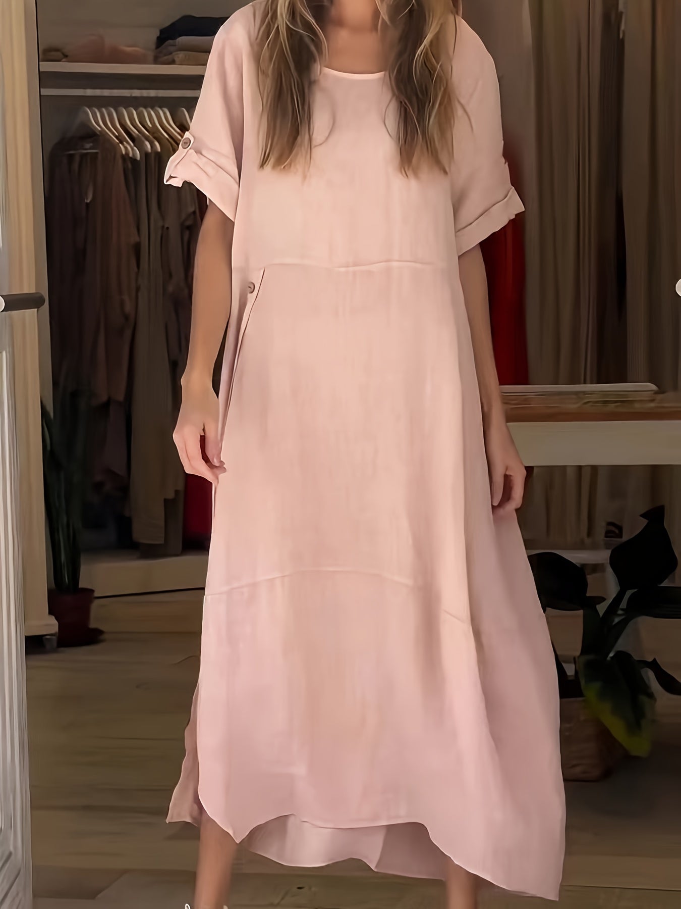 Women's Summer Casual Casual Solid Color Short-sleeved Hemp Maxi Dress
